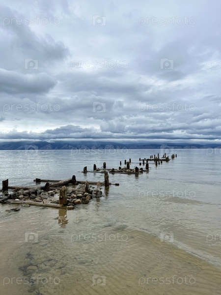 Старый разрушенный пирс на берегу озера Байкал, Ольхон, Россия
