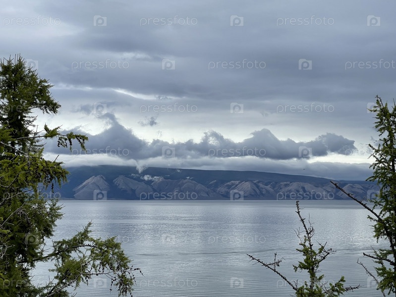 Тяжелые серые облака над озером Байкал, остров Ольхон, Россия
