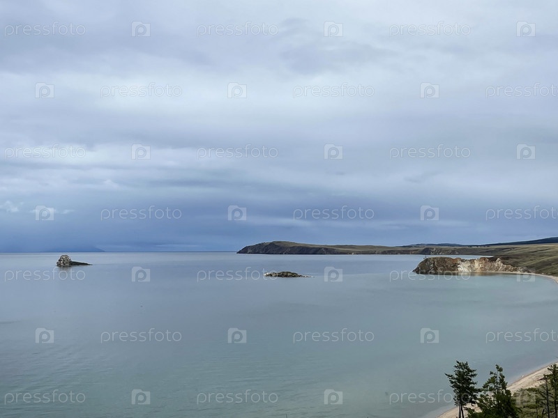 Тяжелые серые облака над озером Байкал, хмурый дождливый день, туманная дымка над водой