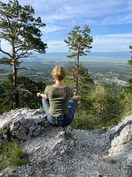 Молодая женщина сидит в позе лотоса и медитирует на вершине горы Саян в Саянах