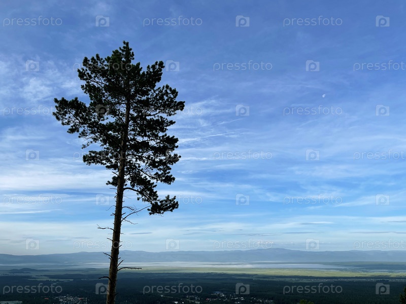 Высокий кедр, растущий одиноко, на фоне села в долине Саян с высоты птичьего полета. Бурятия. Россия