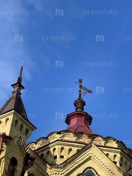 18 июля 2022 г. - Иркутск, Россия: Городской Дворец детского и юношеского творчества. Строительный шпиль на фоне голубого неба