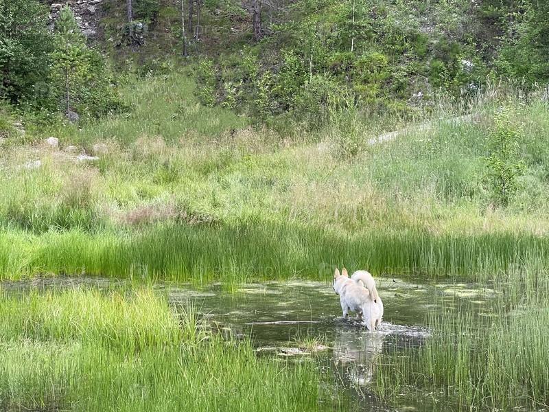 Бездомная собака стоит у озера в лесу