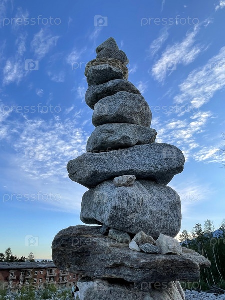 Пирамида из камней на фоне неба, концепция баланса