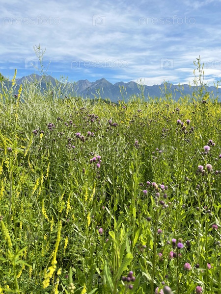Вид на поле цветущих полевых цветов в Тункинской долине на фоне гор Восточного Саяна. Летнее путешествие в Бурятию, Россия
