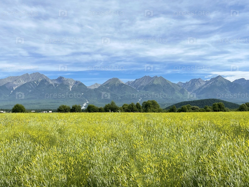 Вид на поле цветущих полевых цветов в Тункинской долине на фоне гор Восточного Саяна. Летнее путешествие в Бурятию, Россия