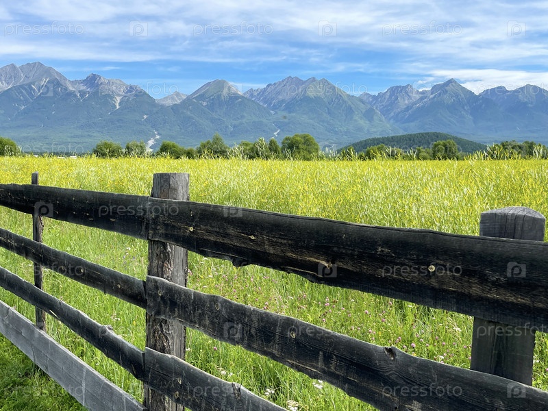 Вид на поле цветущих полевых цветов в Тункинской долине на фоне гор Восточного Саяна. Летнее путешествие в Бурятию, Россия