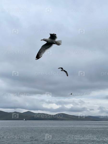 Чайка летит в небе над Байкалом. Красивый горный пейзаж в пасмурный день