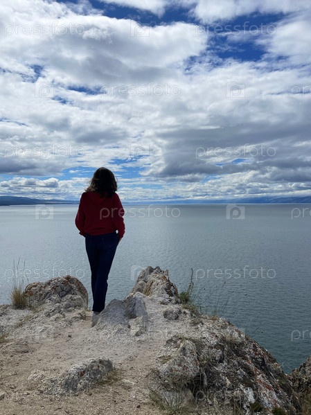 Молодая женщина на крутой скале смотрит вдаль на мыс Хобой, озеро Байкал