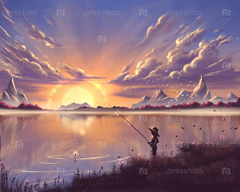 Мальчик ловит рыбу на закате