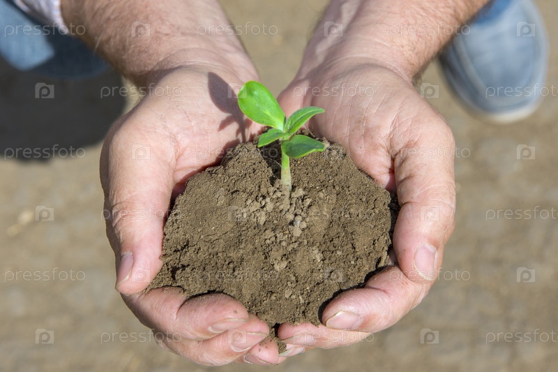 Зеленый росток с землей в руках