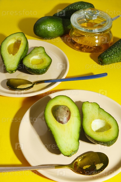 Ломтики авокадо на тарелках со свежим авокадо на желтом фоне, жесткий свет