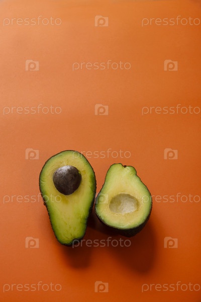 Два простых ломтика авокадо на ярко-оранжевом фоне, пространство для копирования