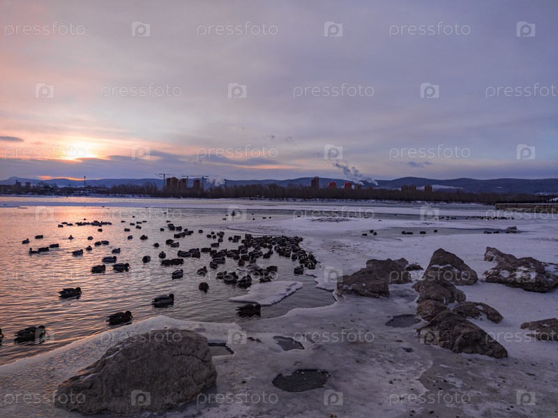 Морозное туманное зимнее утро над рекой Енисей в центре Красноярска