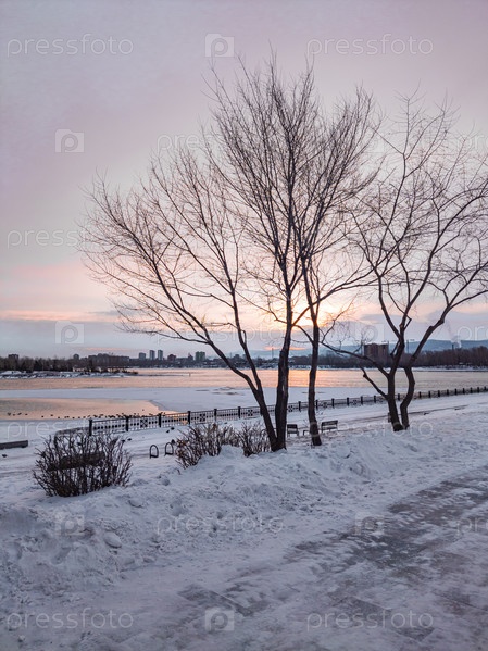 Морозное туманное зимнее утро над рекой Енисей в центре Красноярска