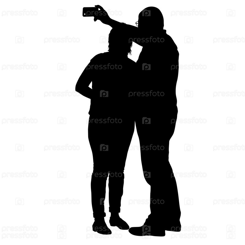 Силуэты мужчины и женщины, делающих селфи со смартфоном на белом фоне