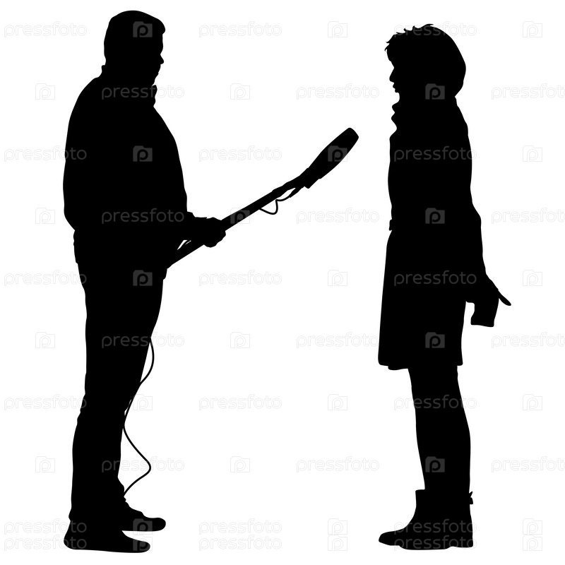 Оператор силуэта удаляет журналиста с микрофоном на белом фоне