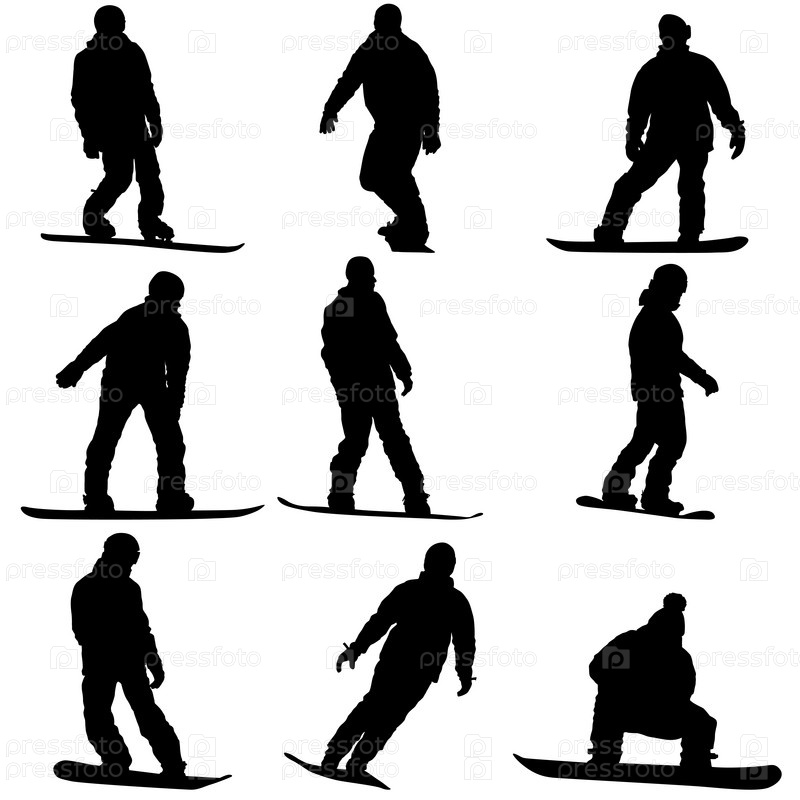 Установите черные силуэты сноубордистов на белом фоне