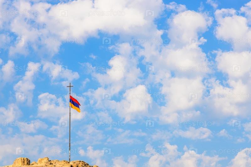 Армянский флаг на шесте с крестом на вершине холма