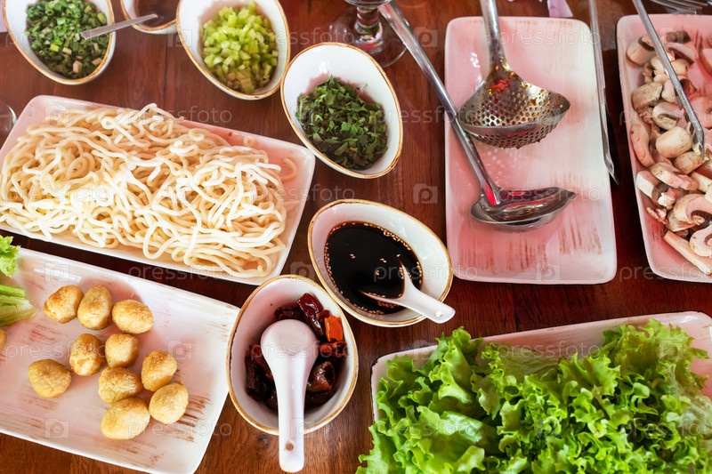 Различные ингредиенты для приготовления супа с тушеным мясом