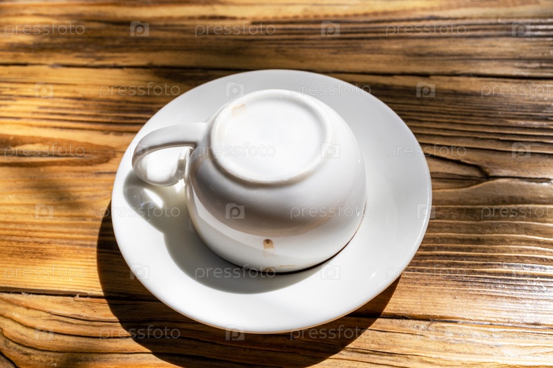 Перевернутая чашка белого кофе после питья кофе