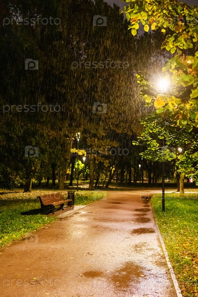 Мокрая дорожка и деревянная скамейка в городском парке ночью