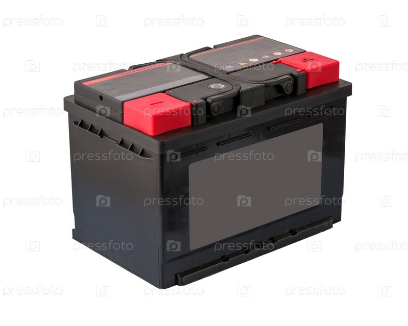 Черный автомобильный аккумулятор крупным планом на белом фоне