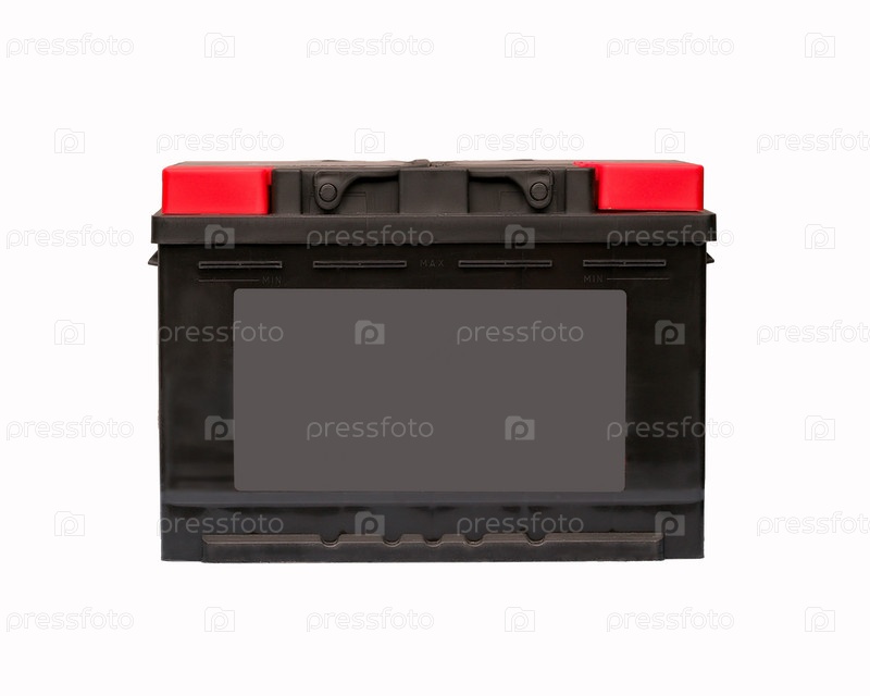 Черный автомобильный аккумулятор крупным планом на белом фоне, вид спереди