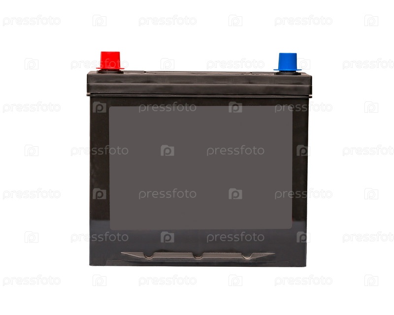 Черный автомобильный аккумулятор крупным планом на белом фоне, вид спереди