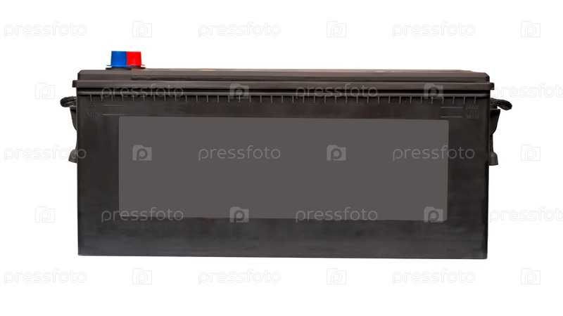 Черный автомобильный аккумулятор крупным планом на белом фоне, вид спереди