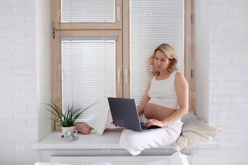 Молодая беременная женщина работает за ноутбуком. Беременная фрилансер. Портрет молодой беременной женщины, использующей онлайн-ноутбук