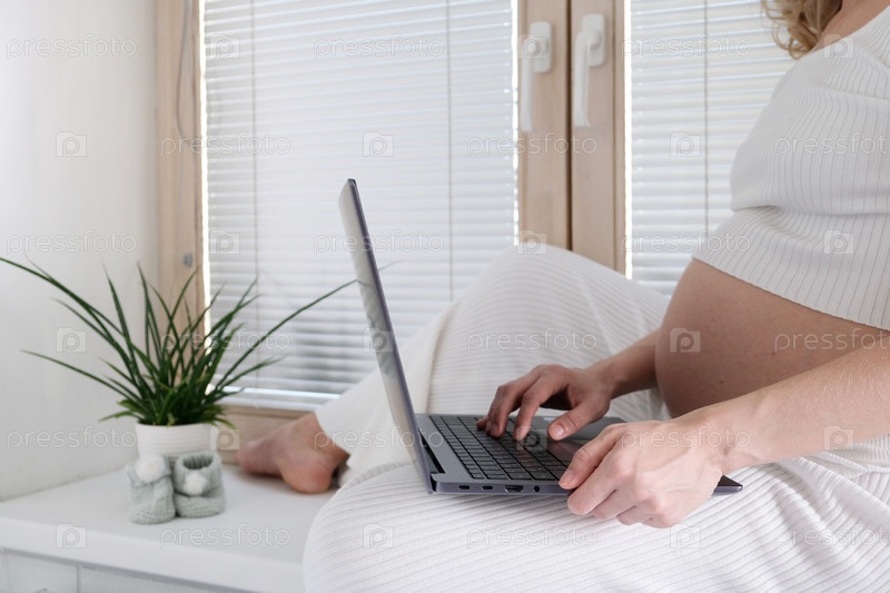Молодая беременная женщина работает за ноутбуком. Беременная фрилансер. Портрет молодой беременной женщины, использующей онлайн-ноутбук