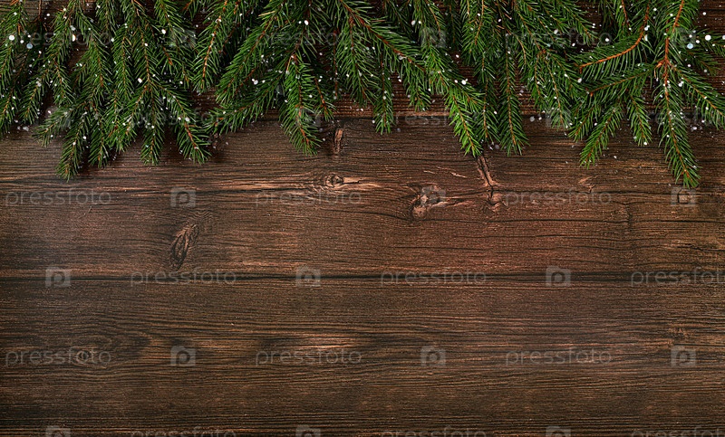 Рождество и Новый год 2024 фон с еловыми ветвями, покрытыми снежинками на деревянном столе, игрушками и украшениями, баннером для праздничного экрана, шаблоном для дизайна. Праздничная открытка