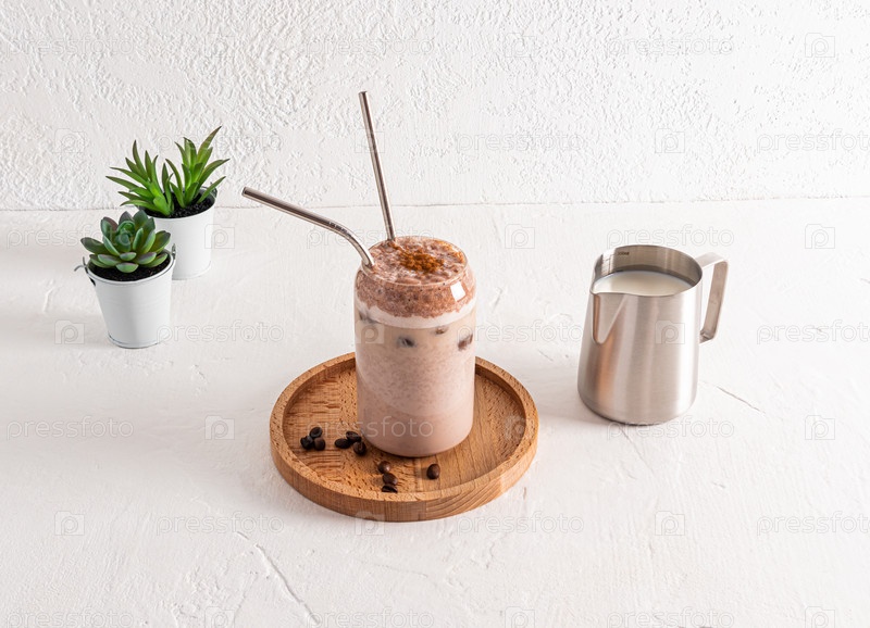 Вкусный ароматный свежезаваренный кофе в стеклянном стакане в форме пивной банки с эко-соломкой стоит на деревянном подносе. белый фон