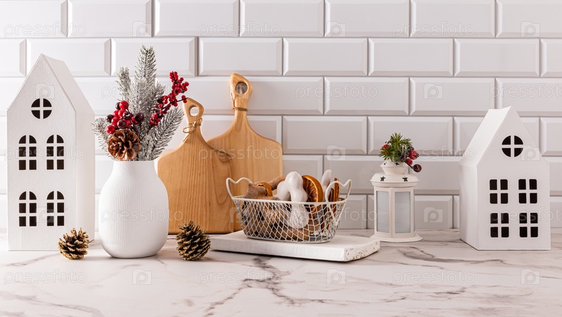 Новогодний рождественский кухонный фон с кухонной утварью и праздничными украшениями в светлых тонах. Столешница из белого мрамора, стена из белого кирпича