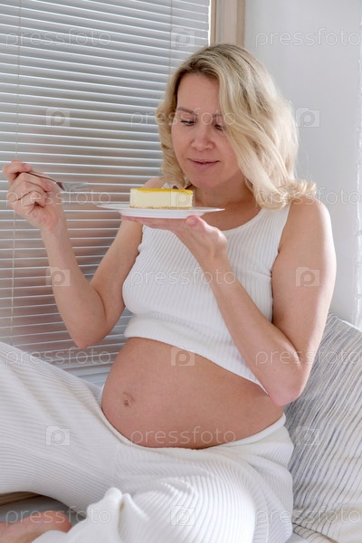 Беременная блондинка ест торт. Здоровье во время беременности. Питание во время беременности