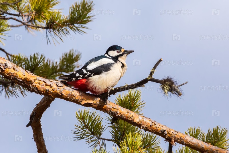 Пятнистый дятел сидит на ветке сосны. Крупный план