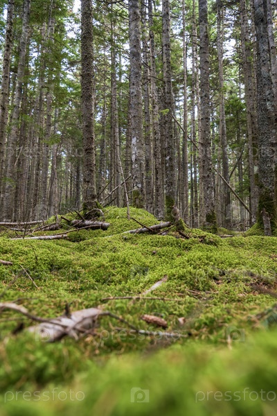 Красивый зеленый мох в еловом лесу