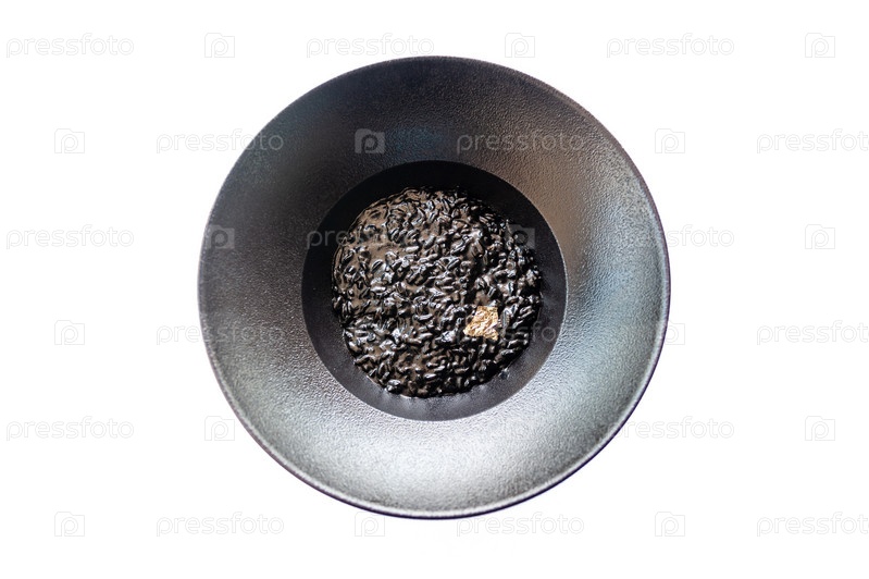 Черное ризотто на черной тарелке изолировано
