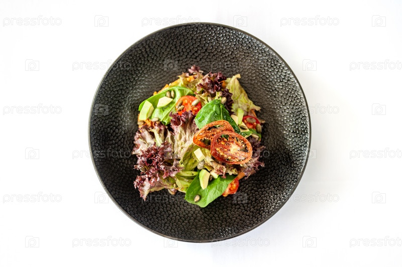 Вегетарианский салат с авокадо, базиликом, салатом и изолированными помидорами черри