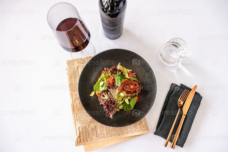 Вегетарианский салат с авокадо, базиликом, листьями салата и помидорами черри