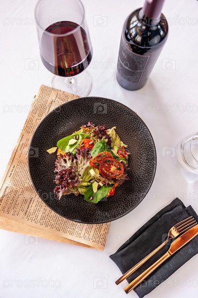 Вегетарианский салат с авокадо, базиликом, листьями салата и помидорами черри