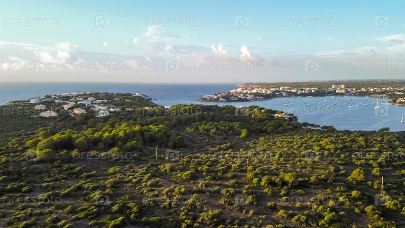 Вид с дрона на Средиземное море на рассвете в Дарсене, лагуна в Порто-Коломе, Майорка, маяк Балеарских островов на скале, типичная туристическая зона, места для отдыха и гостиничная зона