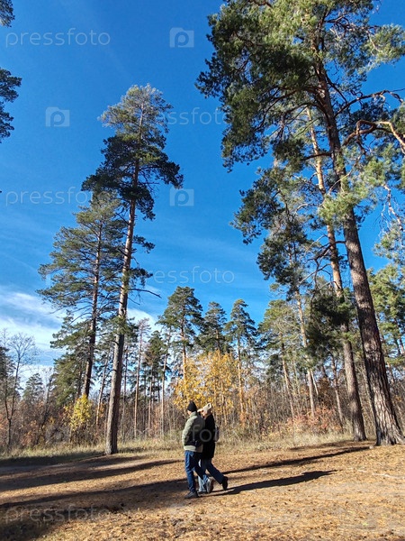 Пара любящих сердец на прогулке в лесу осенью