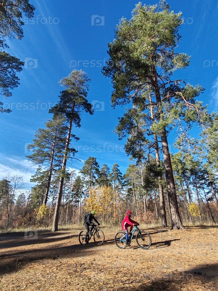 Люди на велосипедах катаются в лесу солнечным днем осенью