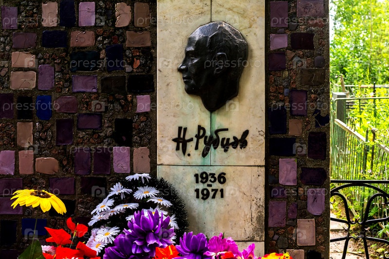 Памятник с барельефом на могиле русского поэта Николая Рубцова. Россия, Вологодская область, г. Вологда, Пошехонское шоссе, 48, Городское Пошехонское кладбище, 30.07.2022 г