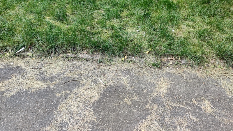 Полоса светлого асфальта и газон. На лужайке растет зеленая короткая трава, рядом серая асфальтированная дорожка. Пожелтевшая скошенная трава лежит на лужайке и дороге