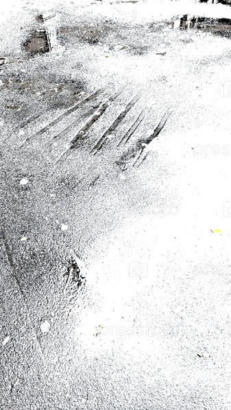Длинные полосы на асфальте. Осенний дождливый день. На бело-черном асфальте, мокром после дождя, несколько прямых вмятин и луж воды. Полосы одинакового размера