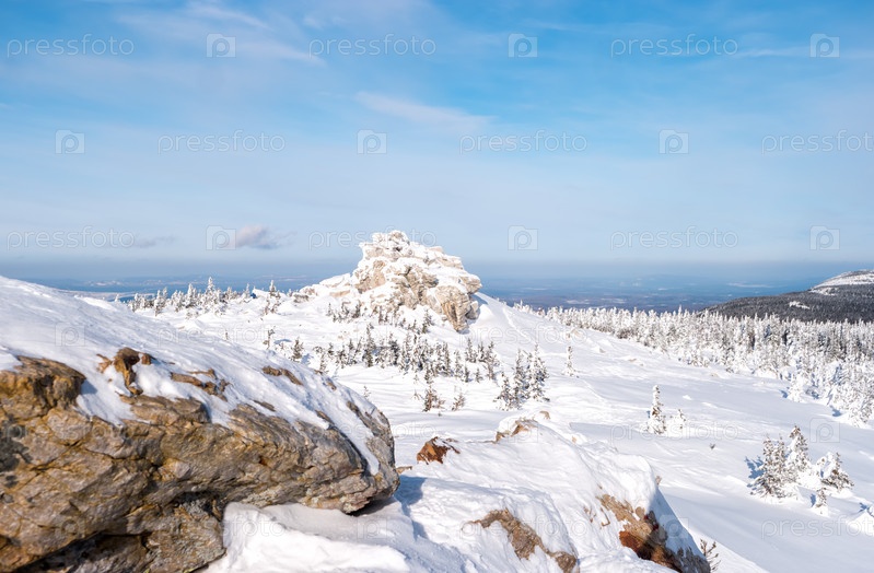 Вид на скалу на вершине горы. Красивый пейзаж с заснеженным хребтом Зюраткуль
