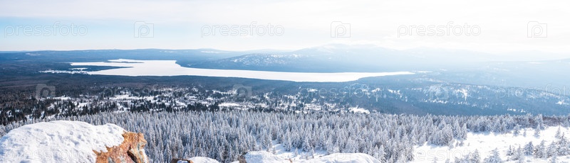 Панорамный вид на озеро Зюраткуль в зимний день. Зимний пейзаж Уральских гор